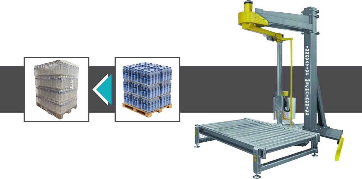 PALLET WRAPPING MACHINE WITH – CONVEYOR SYSTEM also called automatic pallet wrapping machine.